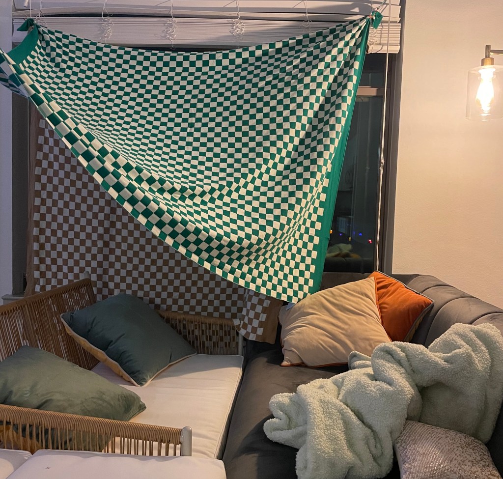Welcome to the fort! It is being held up by a bamboo stick that our rug was wrapped around. When we got the rug we decided to keep the stick because we thought we could do something cool with it. Well, it’s mainly been used to hit the ceiling when the upstairs neighbors are being loud, so not exactly what we were originally thinking, but it serves its purpose.