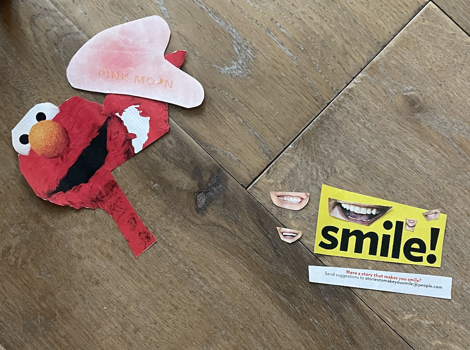 I left all my magazines in Atlanta, but recently I’ve been craving to make a collage. While I was checking my mail the other day I noticed there was a People magazine lying around. I asked the receptionist if it belonged to anyone and she just shook her head so I figured I would take it! The magazine is pretty boring and not what I expected but I thought it would be a good challenge because I normally use more than one magazine when collaging. This is what I came up with. Elmo using a gua sha and a bunch of people smiling. I am not done with the smiling one I am going to continue to use other magazines to cut out smiles and have a huge smiling background and then little stories of what makes people smile.