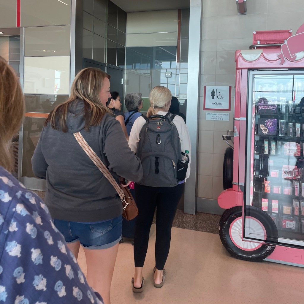 My flight boards in 9 minutes. I contemplated asking someone to watch my bag for a few minutes before deciding I did in fact not want to pee my pants. I asked the man sitting across from me to watch my stuff while I ran to the bathroom. I should’ve left it at that. But no I had to say, “I swear I’m not suspicious”. Why did I do that? Only a suspicious person would do that. After I fumbled that I knew I had to be quick. I hurried over to the bathroom and saw the long line. I was upset. I looked over at the men’s restroom and there was not a person in sight. Why, why, why have we not solved the problem that is women’s restrooms? Why must there always be a line?