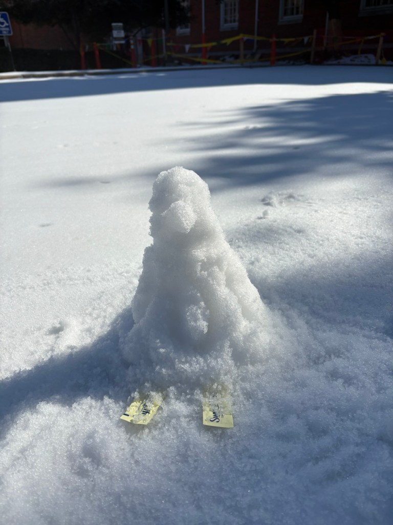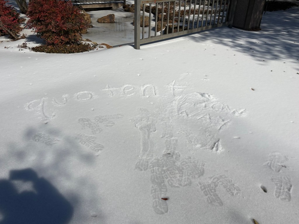 On day 3, I tried again. I got my fingerless mittens on and knew that wasn’t enough, so I grabbed two quart-sized bags, put them on my hands, and secured them with hair ties. I grabbed a cup and left on my mission. Well, there was one problem: it was all ice. I tried digging with my cup to no success, so I decided I’d carve something instead. I knew I wanted to do something for my friends, so I etched in the name of our group chat. My attempts were thorough, but results were minimal. I then wrote ‘snow way’—to the same result.